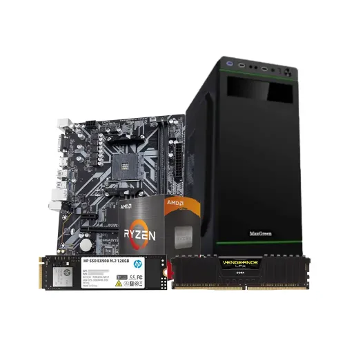 The AMD Ryzen 5 4600G Winter Desktop PC is powered by AMD Ryzen 5 4600G Processor with Radeon Graphics built intelligence featuring 6 processor cores, 12 threads, and an astonishingly efficient 45-65W TDP. This processor stands with 3.7GHz Base Clock, 4.2GHz Max Boost Clock, 3MB L2 Cache, 8MB L3 Cache with AM4 Package, and TSMC 7nm FinFET CMOS. This processor is built with PCIe 3.0 x8 and Wraith Spire Thermal Solution. GIGABYTE B450M H AMD AM4 Micro-ATX Motherboard (China Version) with its latest chipset delivers the highest data transfer with a magnitude of peripheral connection. Enjoy the finest computing with this intelligent mainboard. Thanks to the Corsair Vengeance LPX 8GB 3200MHz DDR4 Desktop RAM enjoy zero delays in loading and handling performance-hungry games. With the HP EX900 M.2 250GB PCIe NVMe Internal SSD, store all your data and OS and still enjoy the fastest read/write speed possible. All these top-tier components are housed in a MaxGreen 5907BG Casing. The Casing comes with a 200W power supply included.
