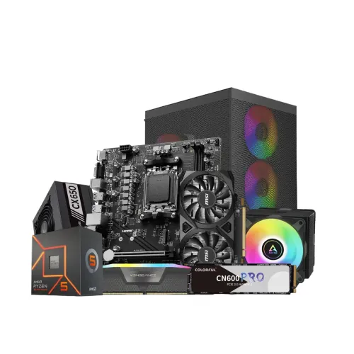 The AMD Ryzen 5 7500F Gaming Desktop PC is a powerful machine designed for high-performance gaming and multitasking. At its core is the AMD Ryzen 5 7500F Processor, featuring six cores and twelve threads, which provides impressive speed and energy efficiency for gaming and content creation. Paired with the MSI PRO B650M-E AM5 mATX Motherboard, this system is equipped to handle the latest DDR5 memory, ensuring smooth and fast performance across various tasks. It boasts Corsair VENGEANCE RGB 16GB DDR5 6000MHz CL36 Desktop RAM clocked at 6000MHz, which enhances multitasking capabilities and delivers blazing-fast speeds for gaming and streaming. Storage is handled by the Colorful CN600 PRO 1TB M.2 NVMe SSD, providing rapid load times and ample space for games and media. Visuals are powered by the MSI GeForce RTX 3050 VENTUS 2X E 6G OC GDDR6 Graphics Card, ensuring stunning graphics and high frame rates in even the most demanding AAA titles. To maintain optimal temperatures during intense gaming sessions, the Arctic Freezer 36 ARGB Air CPU Cooler provides effective cooling, while its ARGB lighting adds a touch of style. The system is powered by the Corsair CX Series CX650 650W 80 PLUS Bronze ATX Power Supply, which ensures efficient and stable energy delivery. All of this is housed in the stylish MaxGreen Mesh Pro A10 M-ATX Mid-Tower Gaming Casing, offering excellent airflow and a sleek design with customizable RGB lighting. This gaming desktop is a perfect blend of power, speed, and aesthetics, designed to provide an immersive gaming experience with room for future upgrades.