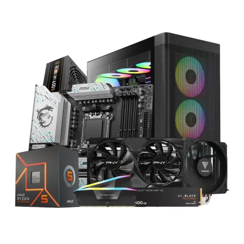 The AMD Ryzen 5 7500F Processor Gaming PC is a powerful and reliable choice for gamers looking to enjoy smooth gameplay and high performance in modern AAA titles. Powered by the advanced AMD Ryzen 5 7500F processor, this AMD Ryzen 5 7500F Gaming PC ensures fast multitasking, efficient game rendering, and overall strong computing capabilities. It is perfectly paired with the MSI B650M GAMING PLUS WIFI AM5 motherboard, offering enhanced stability and connectivity for gaming and content creation. With Corsair VENGEANCE RGB 16GB DDR5 5200MHz CL40 RAM, this AMD Ryzen 5 7500F Processor Desktop PC delivers excellent responsiveness and quick load times during intense applications. The graphics performance is boosted by the PNY GeForce RTX 5060 8GB OC Dual Fan GDDR7 graphics card, delivering exceptional frame rates and visually immersive experiences. To ensure faster system boot and faster game access, it comes with a Western Digital SN7100 500GB NVMe PCIe Gen 4.0 SSD. Housed in the stylish and airflow-optimized Gamdias ATHENA M3 ARGB E-ATX mid-tower casing, this AMD Ryzen 5 7500F Processor Gaming PC also includes a MSI MAG A650BN 650W 80 Plus Bronze Power Supply for stable performance and a Gamdias ST-BOREAS E1-411 SE CPU Air Cooler to maintain low temperatures during heavy workloads. This complete build offers a premium experience for gamers seeking both performance and aesthetics.