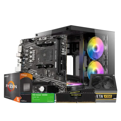 The AMD Ryzen 5 5600G Budget Desktop PC is an excellent example of a Ryzen 5 Desktop PC that strikes the ideal blend of performance, style, and price, making it a standout 5600G Desktop PC for consumers looking for a streamlined yet powerful machine. The AMD Ryzen 5 5600G Processor with Radeon Graphics is at the heart of this construction, handling multitasking and integrated graphics needs with ease, ideal for recreational gaming and creative projects, while laying the groundwork for a low-cost Ryzen 5 Desktop PC. The MSI A520M-A Pro AM4 AMD Micro-ATX Motherboard supports the processor and provides solid connectivity and upgrade potential, while 2 x Corsair Vengeance LPX 8GB 3200MHz DDR4 Desktop RAM works in tandem to deliver smooth, responsive performance across a wide range of applications. The Western Digital Green SN350 500GB M.2 NVMe Gen3 SSD increases efficiency and speed, resulting in faster boot times and data access, an important characteristic that distinguishes this system as a real 5600G Desktop PC geared for modern computing needs. The Gamdias AURA GP300 300W Power Supply adds to the system's dependability by providing efficient and stable power delivery, while the Antec VCX20M ARGB M-ATX Mini Tower Gaming Casing not only improves the PC's visual appeal but also promotes optimal airflow, ensuring long-term performance even under heavy use. This precisely designed configuration embodies the greatest features of a Ryzen 5 Desktop PC, giving a powerful combination of performance, versatility, and style suited for customers seeking quality computing without compromising on budget.