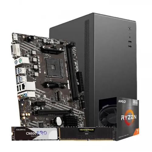 The AMD Ryzen 7 5700G Custom Desktop PC is a powerful and versatile computer capable of gaming, productivity, and entertainment. It has an AMD Ryzen 7 5700G Processor with Radeon Graphics, an 8-core, 16-thread CPU with integrated graphics, and overclocking capability. The MSI A520M-A Pro AM4 AMD Micro-ATX Motherboard features a clean, beautiful design and supports the latest AMD AM4 CPUs. The 8GB of Corsair Vengeance LPX DDR4 RAM, paired with the Colorful CN600 PRO 256GB M.2 NVMe SSD, delivers quick, smooth performance for your system. The MValue-Top V200 Micro ATX Casing With PSU offers a sleek design and a transparent side panel that shows off your components. The AMD Ryzen 7 5700G Custom Desktop PC is an excellent choice for anybody looking for a powerful and versatile PC to tackle any work or game.
