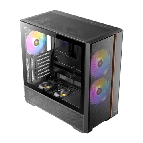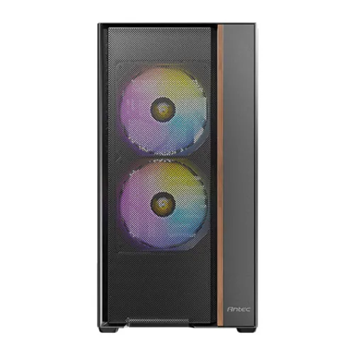 The Antec FLUX REAR Mid Tower Gaming Casing is a durable and elegant PC case aimed at gamers and enthusiasts that appreciate airflow, aesthetics, and use. This Antec FLUX REAR Gaming Casing is made of steel, plastic, and wood and has a 4mm tempered glass side panel that showcases your components nicely while also assuring longevity. Supporting ATX, Micro-ATX, and ITX motherboards, the Antec FLUX REAR Casing comes pre-installed with five PWM ARGB fans—including 2×140mm ARGB fans at the front, 2×120mm reverse fans on the PSU shroud, and 1×140mm ARGB fan at the rear—providing excellent cooling performance and vibrant RGB illumination. Designed for efficient thermal management, it supports radiators up to 360mm on top and 120mm at the rear, delivering superior airflow through its F-LUX platform technology. This Antec FLUX REAR Gaming Casing includes 7 expansion slots, 1×3.5" and 2×2.5" drive bays, and ample clearance for powerful builds, accommodating CPU coolers up to 180mm, GPUs up to 400mm, and PSUs up to 170mm in length. The front I/O panel provides convenient connectivity options with 2×USB 3.0 ports, a Type-C 3.2 Gen 2 port (10Gbps), and a headphone/mic combo jack. With top and bottom dust filters, efficient cable management, and a net weight of 8.18 kg, the Antec FLUX REAR Casing offers a perfect blend of modern design, cooling efficiency, and build flexibility—making it one of the best choices for gamers who want both performance and premium aesthetics.