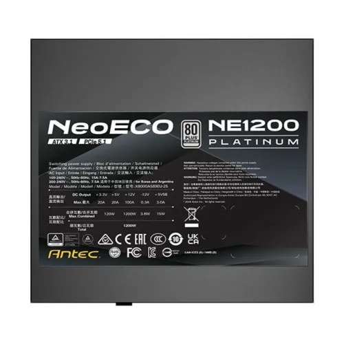 The Antec NE1200 PLATINUM ATX3.1 1200W 80+ Platinum Full Modular Power Supply supports ATX 12V 3.1 standard and compatibility with modern hardware platforms. The Antec Power Supply offers 1200W output capacity with 80 Plus Platinum certification for excellent energy efficiency and reduced power loss. Antec NE1200 PLATINUM ATX3.1 Power Supply includes full modular cables that improve airflow and simplify clean cable management for better system organization. Antec 1200W 80+ Platinum Power Supply supports input voltage from 100V to 240V with input current ranging between 10A and 5A. Antec Full Modular Power Supply operates within a frequency range of 50Hz to 60Hz and uses Active PFC for efficient power delivery. The Antec NE1200 PLATINUM ATX3.1 1200W 80+ Platinum Power Supply provides stable power good signal timing between 100ms and 150ms for reliable startup performance. Antec 1200W Power Supply integrates CircuitShield protection including OCP OVP UVP SCP OPP OTP SIP and NLO for complete system safety. Antec NE1200 PLATINUM ATX3.1 1200W 80+ Platinum Power Supply uses high quality Japanese capacitors to ensure tight voltage regulation and minimal ripple noise. Antec Power Supply features PhaseWave design with LLC topology and DC to DC conversion for efficient stable output. Antec 1200W 80+ Platinum Power Supply supports PCIe 5.1 with 16 pin 12V-2x6 GPU connector for modern graphics cards. The Antec NE1200 PLATINUM ATX3.1 1200W 80+ Platinum Power Supply includes connectors like 24 pin motherboard dual CPU PCIe SATA and Molex for flexible system building. Antec 80+ Platinum Power Supply operates within 0 to 40 degrees Celsius and meets certifications like TUV CE FCC and others. Antec 1200W Power Supply features a 120mm FDB silent fan with Zero RPM Manager for quiet cooling and longer lifespan.