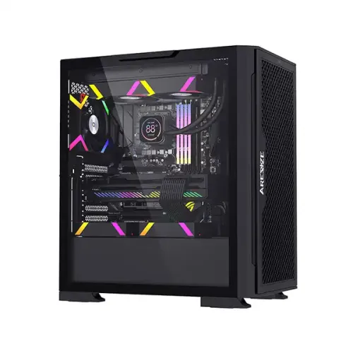 The Aresze KT02B Mid-Tower Gaming Case is crafted for serious gamers and PC enthusiasts who seek a balance of style, functionality, and performance. This E-ATX/ATX-compatible case features a tempered glass left-side panel, showcasing a sleek, high-quality view of internal components. Built for durability, its minimalist design pairs well with gaming setups and allows users to highlight their hardware and RGB effects with ease. To ensure optimum cooling, the KT02B comes equipped with an advanced airflow system. Pre-installed with four 120mm ARGB fans, each fan incorporates 16 outer LEDs and 8 inner LEDs, creating vibrant lighting effects and keeping components cool during heavy gaming sessions. For added customization, the main fan is designed with an extended cable motherboard connector and reset connector, offering control over lighting and fan performance. Users can expand the cooling setup to support up to eight 120mm fans or integrate a 360mm water cooler, making it adaptable to various high-performance configurations. The KT02B offers flexibility in hardware compatibility, with a GPU cooler height limit of 340mm and a CPU radiator height of up to 180mm. The casing allows for a vertical graphics card installation, opening up more options for customization. Inside, it provides two HDD trays and two SSD trays, ample for storing large game libraries or media files. The KT02B includes one USB 3.0 port, two USB 2.0 ports, and an HD audio port on the front panel, facilitating easy access for connecting peripherals. With dimensions of 397x240x457mm, the casing offers generous interior space while remaining compact enough to fit comfortably on most desktops. The inclusion of 7+3 PCI expansion slots also ensures that users have the capacity for additional components and future upgrades, making this case a solid choice for those who want a stylish and efficient gaming rig.