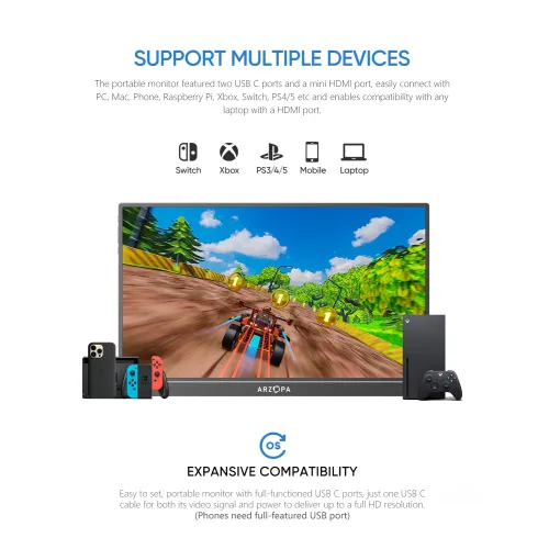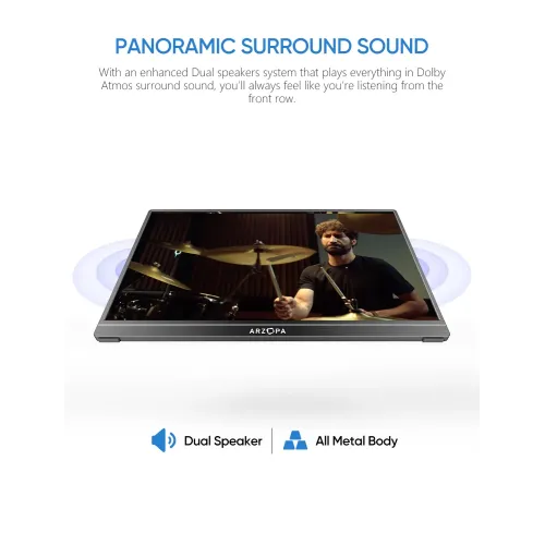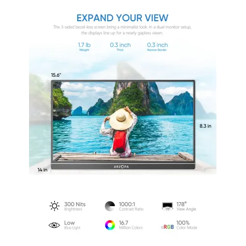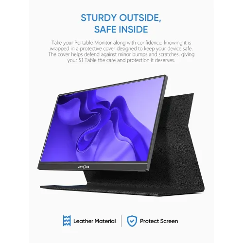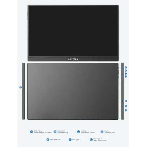 The Arzopa S1 Table Portable Monitor has a 15.6-inch Full HD 1920x1080 IPS panel with a 16:9 aspect ratio, delivering vivid visuals, 16.7 million display colors, a 6800K color temperature, and a 1000:1 contrast ratio for clear and balanced image quality. The Arzopa S1 Table Portable Monitor boasts 300cd/m2 brightness, 72% color gamut coverage, and wide viewing angles of H: 85°/85° minimum and V: 85°/85° minimum, ensuring consistent viewing from various positions. The anti-glare screen lowers reflections for more comfortable use, and the 60Hz refresh rate ensures smooth everyday performance for business and enjoyment. The Arzopa S1 Table 15.6" FHD IPS Portable Monitor uses Mini HDMI for video signals and has a full-function USB Type-C connector that delivers video, data, and power all in one cable, eliminating the need for additional drivers. It is compatible with laptops and USB Type-C smartphones, allowing for effortless screen projection in desktop or phone mode, extending your display and improving multitasking efficiency. Built-in dual 1W speakers provide handy audio assistance. The Arzopa Portable Monitor, which weighs only 860g and has an ultra-slim 9mm profile, fits easily into a travel bag and is great for dual-monitor presentations and remote work. The Arzopa S1 Table 15.6" FHD IPS Portable Monitor also supports landscape and portrait configurations, allowing customers a variety of viewing possibilities for surfing, editing, and streaming.