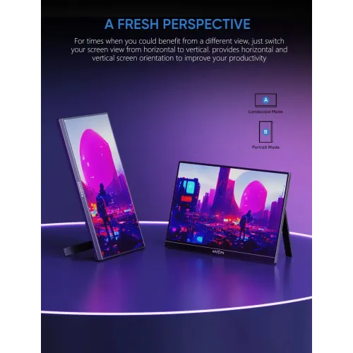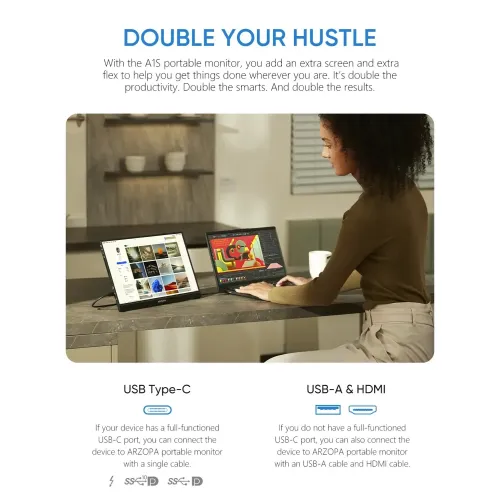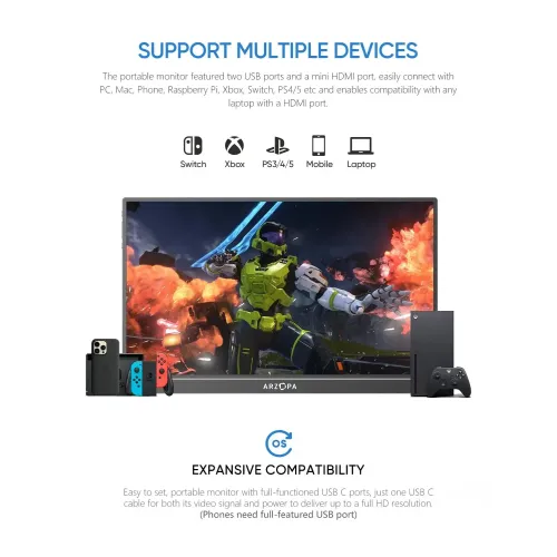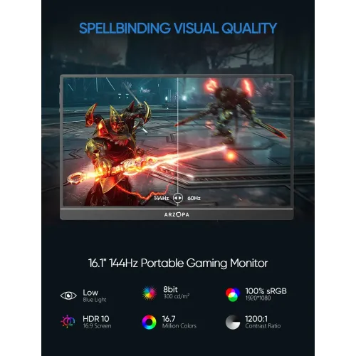 The Arzopa Z1FC 16.1" 144Hz FHD Portable Gaming Monitor is a powerful and flexible display ideal for gamers, professionals, and travelers who require high-performance on-the-go. Featuring a 16.1" The Arzopa Z1FC 16.1" 144Hz FHD Portable Monitor has a Full HD 1920x1080 IPS panel with a 16:9 aspect ratio and offers sharp visuals, 16.7 million display colors, 100% sRGB color gamut, 6800K color temperature, and a 1200:1 contrast ratio for colorful and accurate image quality. The Arzopa Z1FC 16.1" FHD Portable Monitor boasts 300cd/m2 brightness and wide viewing angles of H: 85°/85° minimum and V: 85°/85° minimum, ensuring consistent clarity from multiple views. The ultra-smooth 144Hz refresh rate enables instantaneous on-screen action, giving the Arzopa Portable Gaming Monitor a competitive advantage by providing smoother and crisper animation during fast-paced gameplay. The Arzopa Z1FC Portable Monitor, made of solid aluminum, weighs only 1.7 pounds and is 0.3 inches thick, making it a great laptop companion for the office, home, or travel. The dual USB-C full-function ports support video, data, and power supply, while the Mini HDMI input adds compatibility with PS5, Xbox, Switch, Steam Deck, PCs, and smartphones. The Arzopa Z1FC Portable Monitor also has built-in 1W twin speakers for handy music and a built-in stand that allows for portrait and landscape viewing for versatile setup. Its anti-glare IPS screen allows for pleasant viewing and seamless collaboration, making it simple to share and present from anywhere.