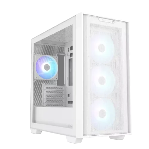 The ASUS A21 PLUS ARGB Mid Tower Gaming Casing in White includes motherboards with hidden connections. This allows you to arrange wires neatly, which makes your project seem better overall. The ASUS A21 PLUS ARGB Mid Tower Casing White is incredibly adaptable. It can support radiators up to 360 mm, graphics cards up to 380 mm long, and CPU coolers up to 165 mm tall. This means that buyers may pick high-performance parts without worrying about how much room they have. The ASUS A21 PLUS ARGB mATX Gaming Casing White features four ARGB fans already fitted. It also has a front mesh panel that is 40% porous, which lets air flow, keeps dust out, and lets RGB lights shine through. This makes it a perfect case for keeping things cool. The ASUS A21 PLUS ARGB Gaming Casing White also has a 33 mm wide space behind the motherboard for organizing connections. This makes it easier to keep wires tidy and the surface smooth. It works with Micro ATX, Mini ITX, and BTF motherboards, so builders can pick from a number of different layouts. There is a 2.5-inch bay and two 2.5- or 3.5-inch combo bays in the system, so you have a lot of storage possibilities. It also offers five spaces for upgrades. The front I/O layout of the ASUS A21 PLUS Gaming Casing White is easy to utilize. You can easily connect devices because it contains USB 3.2 Gen1 ports, a microphone jack, and a headphone jack. Cooling support includes several radiator options on the front, top, and rear, as well as fan support for varied installations. The ASUS A21 PLUS Casing White can fit a 210 mm PSU, which makes sure that modern gear gets power without any problems.