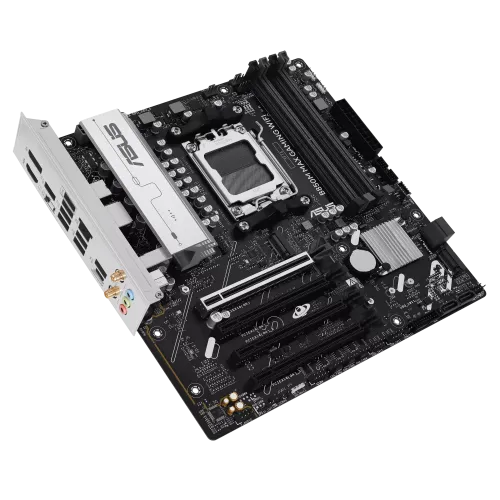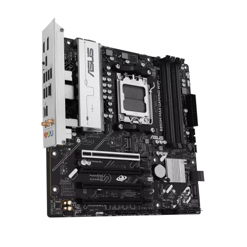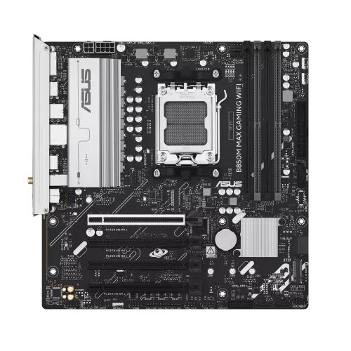 The Asus B850M MAX GAMING WIFI AM5 mATX Motherboard is built on the AMD B850 chipset. The Asus Motherboard supports AMD Ryzen 9000, 8000, and 7000 Series desktop processors, delivering exceptional speed and stability for modern computing. This Asus B850M MAX GAMING WIFI Motherboard features four DDR5 DIMM slots that support up to 256GB of memory and speeds reaching 8000+MT/s (OC), enhanced with dual-channel architecture, AMD EXPO, and ASUS Enhanced Memory Profile (AEMP) for optimized performance. Non-ECC, un-buffered DDR5 memory support with On-Die ECC ensures dependable and efficient multitasking. For visuals, the Asus B850M MAX GAMING WIFI Motherboard provides DisplayPort and HDMI outputs capable of 8K at 30Hz and 4K at 60Hz, depending on your CPU. It offers versatile expansion with PCIe 5.0 and PCIe 4.0 slots, ideal for high-speed GPUs and add-on cards. Storage capabilities are extensive, with three M.2 slots supporting PCIe 5.0 and 4.0 modes, along with four SATA 6Gb/s ports. The Asus B850M MAX GAMING WIFI Motherboard supports RAID 0, 1, 5, and 10 configurations through AMD RAIDXpert2 Technology, maximizing performance and data security. Networking and connectivity are equally robust, featuring Realtek 1Gb Ethernet with ASUS LANGuard, built-in Wi-Fi 6, and Bluetooth 5.4 for seamless online gaming and data transfers. The rear I/O provides nine USB ports, including USB Type-C and 10Gbps options, complemented by premium 7.1 surround sound with Realtek HD Audio CODEC. The Asus B850M MAX GAMING WIFI AM5 mATX Motherboard also incorporates ASUS 5X Protection III, Aura Sync RGB lighting, Fan Xpert 2+, Armoury Crate software, and BIOS FlashBack for easy updates.