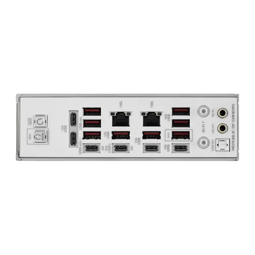 | Internal I/O Ports | Fan and Cooling related 1 x 4-pin CPU Fan header 1 x 4-pin CPU OPT Fan header 2 x 4-pin Chassis Fan headers 2 x 4-pin Radiator Fan headers 2 x W_PUMP+ headers 1 x AIO Q-Connector 1 x Extra Flow Fan header Power related 1 x 24-pin Main Power connector 2 x 8-pin +12V CPU Power connector 1 x 8-pin PCIe Power connector Storage related 3 x M.2 slots (Key M) 1 x DIMM.2 slot supports 2 x M.2 slots (Key M) 4 x SATA 6Gb/s ports USB 2 x USB 20Gbps connector (supports USB Type-C®) 2 x USB 5Gbps headers support 4 additional USB 5Gbps ports 3 x USB 2.0 headers support 6 additional USB 2.0 ports Miscellaneous 1 x 6-pin ARGB Gen 2 header to support 2 x ARGB Gen 2 headers 2 x Addressable Gen 2 header 1 x Alteration PCIe mode switch 2 x BCLK button 1 x BIOS Switch 1 x FlexKey button 1 x Front Panel Audio header (F_AUDIO) 1 x LN2 Mode jumper 12 x ProbeIt Measurement Points 1 x ReTry button 1 x RSVD header 1 x Safe Boot button 1 x Start button 1 x 10-1 pin System Panel header 1 x Thermal Sensor header Back Panel I/O Ports: 2 x USB4 (40Gbps) ports (2 x USB Type-C®) 12 x USB 10Gbps ports (8 x Type-A + 4 x USB Type-C®) 1 x Wi-Fi Module 2 x Realtek 10Gb Ethernet ports 2 x LED-illuminated audio jacks 1 x Optical S/PDIF out port 1 x BIOS FlashBack™ button 1 x Clear CMOS button |