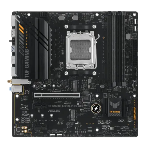 The ASUS TUF GAMING A620M-PLUS WIFI is a Micro-ATX motherboard designed for gaming. It supports the AMD Socket AM5 for AMD Ryzen 8000 & 7000 Series Desktop Processors. The motherboard features the AMD A620 chipset and supports up to 192GB of DDR5 memory with speeds up to 7600MHz+ (OC). It has dual-channel memory architecture and supports AMD Extended Profiles for overclocking. The graphics capabilities include 2 x DisplayPort and 1 x HDMI ports, with support for high-resolution displays up to 8K at 60Hz and 4K at 60Hz respectively. The expansion slots consist of 1 x PCIe 4.0 x16 slot for the CPU and 2 x PCIe 3.0 x1 slots for additional expansion cards. For storage, it has 2 x M.2 slots (supporting PCIe 4.0 x4 mode) and 4 x SATA 6Gb/s ports. The ASUS TUF GAMING A620M-PLUS WIFI Motherboard also features 1 x Realtek 2.5Gb Ethernet, USB 3.2 Gen 1 and USB 2.0 ports, Realtek 7.1 Surround Sound High Definition Audio CODEC, and various internal I/O connectors for fans, power, storage, and USB. It comes with ASUS TUF PROTECTION features for enhanced durability, ASUS Q-Design for easy installation and maintenance, and ASUS Thermal Solution for efficient cooling. The ASUS TUF GAMING A620M-PLUS WIFI Motherboard supports ASUS-exclusive software such as Armory Crate and AI Suite 3 for system optimization and control. It is compatible with Windows 11 and Windows 10 64-bit operating systems.