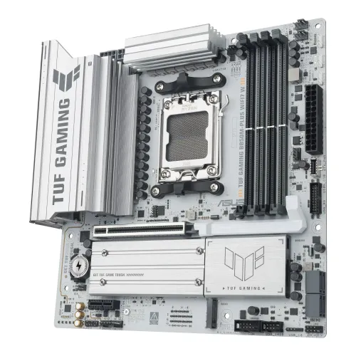 The ASUS TUF GAMING B850M‑PLUS WIFI7 W mATX Motherboard is designed for gamers and PC builders who demand durability, stability, and next‑generation performance. Built on the AMD B850 chipset and supporting Ryzen 9000, 8000, and 7000 series processors, this Asus White Motherboard combines military‑grade components, advanced cooling, and WiFi 7 connectivity to deliver reliable power for gaming and productivity.