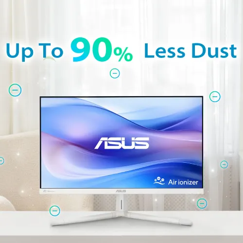 With its built-in air ionizer, the Asus VU279HFI-W 27" Eye Care Monitor can eliminate up to 90%* of airborne dust in three hours, leaving your personal space fresher and cleaner. The ionizer is perfect for people who spend a lot of time in front of a television since it purifies the air right in front of the viewer, allowing for comfortable productivity and entertainment. Its effective coverage area is 1m³. Without the use of filters, the Asus Monitor's Nano-ion technology efficiently removes air contaminants by using negative ions.