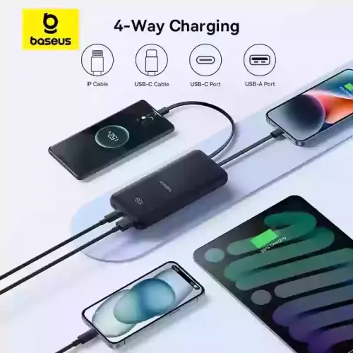 The Baseus Extreme PPJP312 22.5W 20000mAh Power Bank is a high-performance portable charging solution engineered for users who demand fast, reliable, and versatile power on the go. With a massive 20000mAh capacity (3.7V/74Wh) and a rated output of 11000mAh at 5V⎓3A, this power bank is ideal for charging smartphones, tablets, and other USB-powered devices multiple times. It supports a wide range of input options including 5V⎓2A, 9V⎓2A, and 12V⎓1.5A ensuring quick recharging of the power bank itself. On the output side, it features USB-C and USB-A ports, along with dedicated USB-C and iP cables, delivering fast charging speeds such as USB-C Output: 5V⎓3A, 9V⎓2.22A, 12V⎓1.67A, and USB-A Output: 5V⎓3A. The USB-C cable output supports up to 4.5V⎓5A, making it perfect for high-speed charging of compatible devices, while the iP cable output delivers up to 9V⎓2.22A, catering to Apple users. With a total output of 5V⎓3A, this Baseus Extreme PPJP312 power bank ensures efficient power distribution across multiple devices. Whether you're traveling, commuting, or working remotely, the Baseus Extreme PPJP312 offers a compact, durable, and feature-rich charging companion that blends power and portability. Its advanced safety features and broad compatibility make it a top choice for tech-savvy users seeking a dependable power source.
