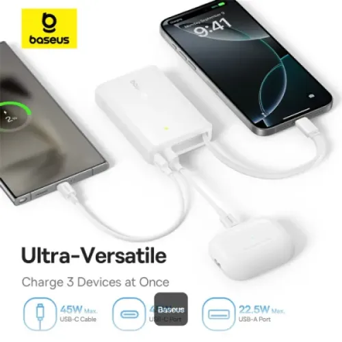 The Baseus PicoGo PPPG-1W45C 10000mAh 45W Fast Charging Power Bank with Cable (Type-C) in sleek white is a compact yet powerful solution for on-the-go charging. Engineered with a high-quality lithium polymer battery, this power bank delivers a robust 10000mAh capacity and a rated output of 5600mAh, ensuring reliable energy backup for smartphones, tablets, and USB-C laptops. Designed for speed and versatility, it supports USB-C input at up to 30W (5V/3A, 9V/3A, 12V/2.5A, 15V/2A) and USB-C output at a blazing 45W max (5V/3A, 9V/3A, 12V/3A, 15V/3A), making it ideal for fast-charging compatible devices. With PPS support (5-11V/5A), it intelligently adjusts voltage for optimized performance. The USB-A output offers multiple voltage profiles including SCP (10V/2.25A), ensuring compatibility with a wide range of gadgets. Simultaneous charging is seamless with a combined USB-C and USB-A output at 5V/3A. Whether you're traveling, commuting, or working remotely, the Baseus PicoGo PPPG-1W45C delivers efficient, high-speed charging in a stylish and portable form factor perfect for tech-savvy users who demand performance and convenience.