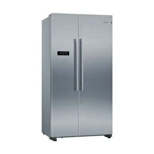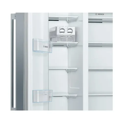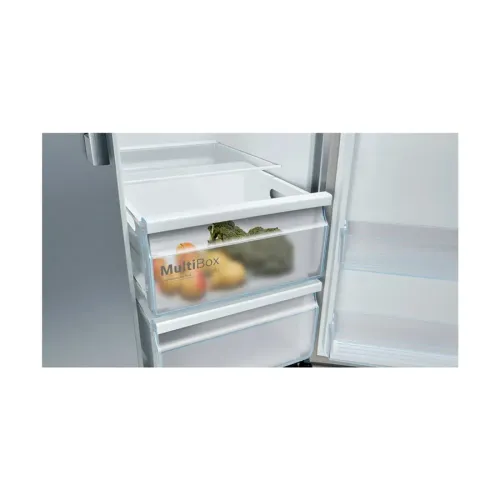 The BOSCH KAN93VL30M Series 4 616L Refrigerator is a high‑capacity Modern Fridge designed for families who need both performance and generous storage in a stylish package. With a total capacity of 616 litres, the BOSCH KAN93VL30M Series 4 stands out as a Large Refrigerator that easily accommodates weekly groceries, bulk items, and family staples. Its premium stainless‑steel look, paired with grey side panels, makes an elegant addition to any contemporary kitchen. Engineered as a reliable double-door fridge, the BOSCH KAN93VL30M Series 4 offers a side‑by‑side layout, ensuring convenient access to both refrigerated and frozen sections. Equipped with Total NoFrost technology, this model eliminates ice formation and removes the need for manual defrosting, reinforcing its appeal as a low‑maintenance Modern Fridge. The Multi Airflow System enhances cooling consistency throughout the compartments, keeping food fresh for longer. The BOSCH KAN93VL30M Series 4 integrates a VarioInverter compressor, enabling the appliance to adapt cooling efficiency to internal load and external temperature conditions. Inside the Smart refrigerator compartment, the BOSCH KAN93VL30M Series 4 offers 380 litres of organized space, featuring five safety‑glass shelves, three door bins, and a versatile MultiBox drawer ideal for storing fruits and vegetables. The long‑lasting LED lighting illuminates the interior evenly without glare. The freezer section of the BOSCH KAN93VL30M Series 4 provides 236 litres of storage capacity, including two transparent drawers and five door trays. With a freezing capability of 12 kg in 24 hours, it ensures rapid preservation of newly added items. Additional features such as Supercool, super freezing, and an optical and acoustic door‑open warning system add convenience and safety. Measuring 178.7 x 90.8 x 70.7 cm and operating at a quiet 42 dB, it is designed for smooth daily use without disruption. Overall, this model offers the perfect blend of capacity, performance, and modern functionality ideal for anyone seeking a durable Modern Fridge, a smart cooling solution, and a spacious double-door fridge.