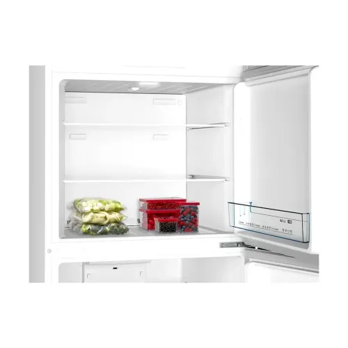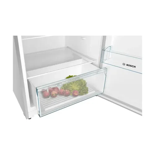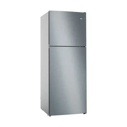 The BOSCH KDN55NL20M Series 4 485L refrigerator is a modern and efficient appliance that combines sleek design with practical functionality. With its stainless steel look and integrated vertical handle, the BOSCH KDN55NL20M Series 4 fits seamlessly into contemporary kitchens. Offering a spacious total gross capacity of 485 liters, divided into a 338-liter refrigerator and a 147-liter freezer. It features 4 shelves in the fridge compartment, 3 of which are adjustable, along with 3 door bins and bright LED lighting for clear visibility. The BOSCH KDN55NL20M Series 4 is equipped with advanced cooling technologies such as the VitaFresh system, which maintains optimal humidity and temperature to keep food fresher for longer. The SuperFreezing function quickly lowers freezer temperatures to protect newly stored items. Energy efficiency is ensured with a 3-star UAE rating and annual consumption of 445 kWh, while quiet operation at 41 dB. It is suitable for open-plan living spaces. The freezer carries a 4-star rating and can safely store food for up to 14 hours during power failures, adding reliability to its performance. Practical accessories like 3 egg trays and an ice cube tray with lid are included, and installation is made flexible with a 220 cm power cord. Measuring 1860 × 700 × 745 mm, with packed dimensions of 1920 × 770 × 830 mm and a net weight of 74.5 kg, the BOSCH KDN55NL20M Series 4 refrigerator delivers durability, convenience, and freshness. A reliable choice for families seeking a balance of style and functionality in regular use.