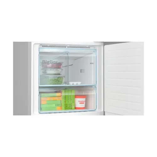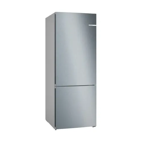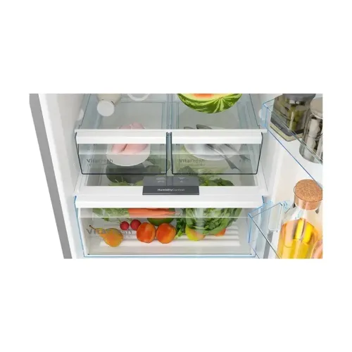 The BOSCH KGN55VL21M Series 4 refrigerator is a 530‑liter, free‑standing fridge‑freezer designed with a stainless‑steel look. And a bottom freezer, offering a practical combination of capacity, efficiency, and ease of use. The BOSCH KGN55VL21M Series 4 measures 1860 mm in height, 700 mm in width, and 800 mm in depth, with a net weight of 85.1 kg, so it's a spacious option for medium to large households. It uses Total No Frost technology in both compartments, so the BOSCH KGN55VL21M Series 4 never needs manual defrosting. The Multi‑Flow Air Tower helps maintain stable temperatures, while VitaFresh compartments keep fruits, vegetables, meat, and fish fresh for longer. This model has adjustable humidity and low‑temperature settings. Inside, the BOSCH KGN55VL21M Series 4 features four safety‑glass shelves, including 3 height‑adjustable shelves and 2 extendible ones, along with 3 door bins, tilt‑out bins, gallon storage, an EasyAccess retractable shelf, and a humidity‑controlled drawer. LED lighting ensures clear visibility throughout the fridge. It also includes SuperCooling, a Fast Cooling switch, and an AirFresh filter for odour control. This model operates with one compressor and two independent cooling systems. The freezer section of the BOSCH KGN55VL21M Series 4 includes two drawers, one being a BigBox for large items, and it supports SuperFreezing with automatic shut-off. During a power failure, it keeps food safe for up to 20 hours. Its PerfectFit design allows installation close to walls and furniture, and it runs quietly at 40 dB(A). The door is right‑hinged but reversible, and the appliance includes an integrated vertical handle, height‑adjustable front feet, rear rollers, and an optical and acoustic door‑open warning system. Power specifications include a 240 cm cord, 100 W connection load, 220-240 V operation at 50 Hz, 10 A fuse protection, and a GB plug.
