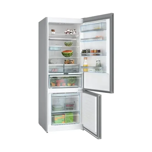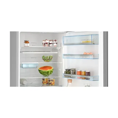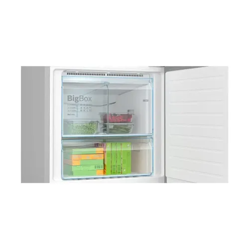 The BOSCH KGN56LB31U Series 6 559L Refrigerator is a premium 559L fridge designed for households that need a reliable, spacious, and modern cooling solution. As a high‑capacity Large Fridge, it provides a top refrigerator and bottom freezer layout that supports convenient daily use. With 417 liters dedicated to refrigeration and 142 liters for frozen storage, the BOSCH KGN56LB31U Series 6 easily handles weekly groceries, family meal prep, and bulk storage needs. This model features a sleek and stylish Black Fridge design with pearl‑grey side panels, giving it a bold, modern look suitable for contemporary kitchens. The refrigerator is freestanding, allowing flexible placement without complex installation. It includes an external temperature display and controller, helping users manage cooling settings easily and accurately. The bright LED lighting ensures excellent visibility across all compartments. With an A++ energy efficiency rating, the BOSCH KGN56LB31U Series 6 supports long‑term savings on electricity. As a feature‑rich Smart Fridge, it includes advanced technologies such as VitaFresh and VitaFresh Plus, which create ideal climate conditions for keeping fruits, vegetables, meat, and dairy fresh for longer. The Multi Airflow system ensures consistent, even cooling throughout the fridge. An Air Fresh Filter minimizes odors, while the extendable safety‑glass shelves, multiple door bins, pull‑out breakfast tray, and included accessories (egg trays, ice tray with lid, and bottle holder) enhance everyday convenience. The freezer section of the BOSCH KGN56LB31U Series 6, part of this Large Fridge system, offers a 105‑liter net capacity and can freeze up to 18 kg of food in 24 hours. It includes two drawers, including a practical BigBox for bulkier frozen items. The Super Freeze function quickly drops temperatures to protect existing frozen food when new items are added. Additional features include a reversible door hinge, adjustable front feet, and a 24‑hour storage duration during power failures. With dimensions of 193 cm × 70 cm × 80 cm, this 559L fridge combines generous storage, smart cooling technology, and an elegant black design, making the BOSCH KGN56LB31U Series 6 an excellent choice for anyone seeking a stylish, efficient, and spacious Smart Fridge for modern homes.