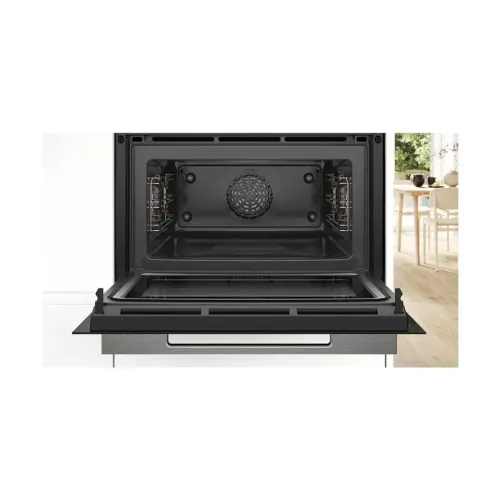 The BOSCH Series 8 CMG7241B1M Microwave Oven excels in performance with Inverter Technology, ensuring gradual heating for better food quality, and Top Bottom Heat Gentle, which saves energy during baking and roasting. Its Automatic Switch-off guarantees dishes are cooked to perfection without overcooking. For easy maintenance, the Cleaning Assistance system uses water and detergent to soften residue, making cleanup quick and eco-friendly. Safety is ensured with a child lock, while included accessories like a universal pan, grill tray, and combination grid expand versatility. Altogether, the BOSCH Series 8 CMG7241B1M delivers innovation, efficiency, and reliability, making it one of the best smart ovens for modern households.