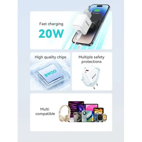 The BWOO BO-CDA157C-L 20W Type-C Charger delivers efficient power output through its dual-interface design—featuring both USB-A and USB-C ports. This charger supports Power Delivery (PD) 3.0 and Quick Charge (QC) 3.0 protocols, enabling rapid charging for a wide range of devices, including smartphones, tablets, and accessories. With a total output of 20 watts, it ensures your devices are powered up swiftly, whether you're using the USB-C port (5V/3A, 9V/2.22A, 12V/1.67A) or the USB-A port (5V/3A, 9V/2A, 12V/1.5A). When both ports are used simultaneously, the charger intelligently balances the load to maintain a stable 5V/3A output, making it ideal for multitasking users. Built with PC+ABS flame-retardant materials, the fast charger offers enhanced durability and safety, while its smart chip technology automatically regulates voltage and current to protect against overcharging, overheating, and short circuits. The wide input range of 100-240V 50/60Hz makes it globally compatible, perfect for travel and international use. Its sleek white finish and lightweight design add a touch of elegance and portability, fitting easily into any bag or workspace. Whether you're an Android or iPhone user, the BWOO BO-CDA157C-L charger is MagSafe compatible and optimized for fast charging across multiple platforms. It comes bundled with a Type-C to Lightning cable, ensuring seamless connectivity.