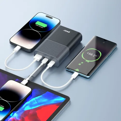 The BWOO BO-P68 10000mAh 30W Power Bank is a powerful portable charger built for those who want power and speed while on the road. This BWOO BO-P68 Power Bank has a 10000mAh high-capacity battery, which allows you to charge your smartphone, tablet, or other digital devices numerous times—making it excellent for travel, commuting, or everyday usage. The BWOO BO-P68 10000mAh Power Bank has 30W PD bi-directional fast charging technology to provide efficient and speedy charging while quickly recharging itself. It has a variety of connecting choices, including Type-C1 input (5V/2.4A, 9V/2A, 12V/1.5A), Lightning input (5V/2.4A, 9V/2A), and Type-C2 input. It supports USB-A (5V/3A, 9V/2A), Type-C (5V/2.4A, 9V/2A Max), and Lightning cable output (5V/2.4A), enabling simultaneous multi-device charging with a maximum output of 5V/3A. One of the most notable features of the BWOO BO-P68 10000mAh 30W Power Bank is its built-in Type-C to Lightning connection, which also serves as a lanyard for optimum mobility and convenience—ideal for Apple customers looking for a clutter-free charging option. This BWOO BO-P68 Power Bank is made of high-quality ABS, TPE, and aluminum alloy materials, making it both robust and elegant. It has a clever protection mechanism that prevents overheating, overcharging, and short circuits, assuring the safety of your electronics. The compact dimension of 152.1×66×26.6mm allows for easy storage in a pocket or purse. The BWOO BO-P68 10000mAh Power Bank is CE, FCC, and RoHS certified and provides a dependable, quick, and safe charging experience, making it a perfect choice for anybody looking for a trusted, high-speed power solution from BWOO.