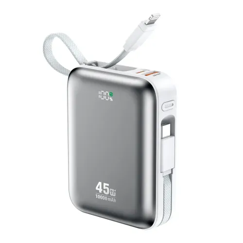 The BWOO BO-P77 is a powerful and adaptable charging solution designed for mobile users. This BWOO BO-P77 10000mAh Power Bank has a large 10000mAh battery capacity, which provides consistent power for smartphones, tablets, and other devices all day. The BWOO BO-P77 Power Bank enables fast charging via USB-C inputs of 5V/3A, 9V/3A, 12V/3A, 15V/2.66A, and 20V/2.25A (PD45W MAX), allowing for quick recharge of the power bank itself. While the Type-C output supports 5V/3A, 9V/3A, 10V/2.25A (SCP), 12V/3A, 15V/3A, and 20V/2.25A for PD45W rapid charging, the USB-A output offers 5V/3A, 9V/2A, 10V/2.25A (SCP), and 12V/1.5A, with a maximum output of 22.5W. The included Lightning cable supports 5V/2.4A and 9V/3A output (PD27W MAX), making it ideal for iPhone and iPad users. Advanced PPS technology guarantees safe and efficient 5V-11V 3A (33W MAX) charging, and the digital LED display indicates real-time battery status. The BWOO BO-P77 10000mAh Power Bank combines portability, convenience, and high-speed charging in a single, attractive gadget. It has numerous interfaces, including USB Type-A and USB Type-C, and a dedicated operating button.