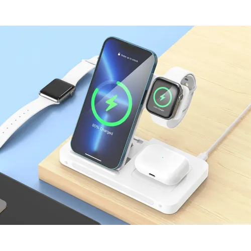 The BWOO BO-WL19 3-in-1 Foldable Wireless Charger the definitive solution for a clutter-free and highly mobile lifestyle. Engineered with an advanced smart chip, this versatile charging station provides dedicated power outputs to simultaneously charge your essentials: up to 15W for your compatible smartphone (supporting 5W/7.5W/10W/15W auto-matching), 5W for your wireless earbuds (AirPods/TWS), and 2W for your Apple Watch. The superior dual-coil design ensures maximum charging efficiency, whether your phone is positioned in portrait for video calls or landscape for media consumption. Designed for ultimate portability, the BWOO BO-WL19 features a foldable, lightweight construction (approx. 130g) that collapses down to a compact size (142mm x 16.5mm x 165mm unfolded), making it an indispensable travel companion that slips easily into any bag. Safety is paramount, with the charger providing a comprehensive suite of multi-layer protection, including overcurrent, overpower, overvoltage, overtemperature, and short circuit safeguards, alongside Foreign Object Detection (FOD). Finally, the built-in, non-dazzling LED decorative light offers three adjustable brightness settings, adding both function and a customizable atmosphere. The BWOO BO-WL19 is your single-cable answer to modern, organized, and worry-free power delivery.