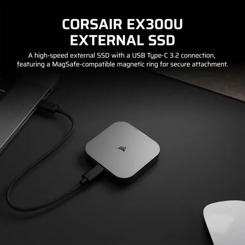 The Corsair EX300U 1TB Type-C Portable SSD is a premium external storage solution that combines blazing-fast performance, universal compatibility, and sleek portability, making it the perfect choice for professionals and everyday users alike. With USB 3.2 Gen 2 Type-C connectivity, this Corsair Portable SSD delivers up to 1,100 MB/s sequential read and write speeds, ensuring smooth transfers of large files such as 4K videos, RAW photos, and project backups. Offering a generous 1TB capacity, the Corsair 1TB Portable SSD provides ample space for documents, media, and applications, while its compact, lightweight design makes it easy to carry anywhere. Built for durability, the Corsair EX300U 1TB Portable SSD features an endurance rating of 250TBW and a 1.4 million-hour MTBF, guaranteeing long-term reliability. It also supports MagSafe attachment, allowing secure magnetic connection to iPhone 15 and other MagSafe-enabled devices for added convenience. Compatible with Windows, macOS, iOS, iPadOS, and Android, this drive ensures seamless cross-platform use. Whether you’re a content creator, gamer, or business professional, the Corsair EX300U 1TB Type-C Portable SSD delivers the speed, reliability, and portability you need to keep your data safe and accessible anywhere.