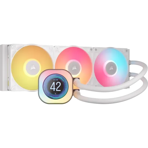 The Corsair iCUE LINK TITAN 360 RX LCD 360mm Liquid CPU Cooler in White has a modern look that fits perfectly with high-end gaming and workstation PCs. It also cools quite well. This cooler has a customisable LCD screen that shows system temps, personal photos, and animated GIFs. This adds both style and usefulness. The Corsair iCUE LINK TITAN 360 RX LCD Liquid CPU Cooler White includes a FlowDrive cooling engine with a three-phase motor that keeps the thermal efficiency high even when the CPU is working hard. The cooler comes with three RX120 RGB fans and has great airflow, ranging from 10.4 to 73.5 CFM, and static pressure up to 4.33 mm H2O. This helps keep systems stable throughout long gaming sessions. There are eight RGB LEDs in each fan and 44 more in the pump and cap. This means that the Corsair iCUE LINK TITAN 360 RX LCD CPU Cooler White can give out bright ARGB illumination that can be easily synced with digital fan control. This Corsair Liquid CPU Cooler works with both modern Intel and AMD builds because it supports a wide range of sockets. It works with Intel LGA 1851 and Intel 1700, as well as AMD AM5 and AM4. People who need their computers to run smoothly will like the noise levels between 10 and 36 dBA. The Corsair iCUE LINK TITAN 360 RX LCD Liquid CPU Cooler White comes with black sleeved low-permeation rubber tubing that lasts for the full 450 mm length. The Corsair iCUE LINK TITAN 360 RX LCD 360mm Liquid CPU Cooler White has a 360 mm aluminum radiator, a copper cold plate, and a fan speed range of 300 to 2100 RPM. This makes it reliable enough for tough conditions.