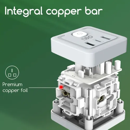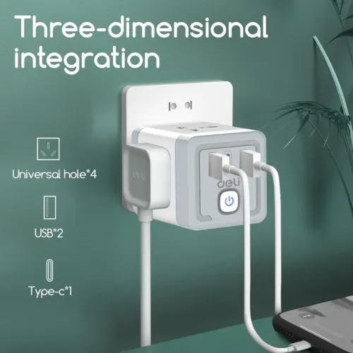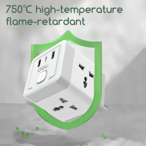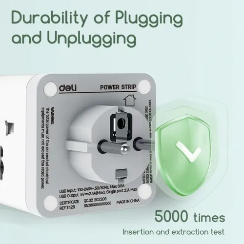The Deli ET426 Travel Adapter features four European standard sockets that allow simultaneous connection of multiple devices without needing additional extension boards. Deli Adapter includes a European standard plug that ensures stable compatibility with standard wall outlets across many regions. Deli ET426 Adapter supports a maximum power of 2500W, making it suitable for powering laptops, chargers, and small appliances efficiently. Deli Travel Adapter provides an output voltage of 250V and output current of 10A for stable and consistent electrical performance. Deli Adapter integrates high quality copper components that improve conductivity and reduce power loss during operation. Deli 2500W Travel Adapter includes two USB A ports and one Type C port for convenient direct charging of smartphones and modern devices. Deli ET426 Travel Adapter uses a single control switching mode that allows users to manage power supply easily with one switch. Deli Adapter features durable PP material construction that enhances strength and long term reliability for daily use. Deli ET426 Adapter includes 750 degree Celsius fireproof material that ensures safety during high temperature or heavy load conditions. Deli Travel Adapter offers a compact design that remains easy to carry while providing multiple connection options in one device. Deli Adapter follows Category II conventional standards to ensure dependable safety and performance in regular usage.