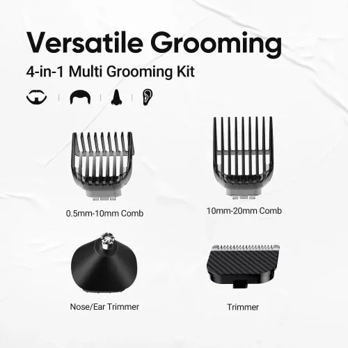 Others | Trimming Range: 0.5 – 20 mm For Beard & Moustache, Nose, Ear & Eyebrow Versatile Grooming, 4-in-1 Multi Grooming Kit IPX5 Fully Washable 40 length setting Type C Charge, 10 min Charge = 15 min use 240 min Battery Run time |