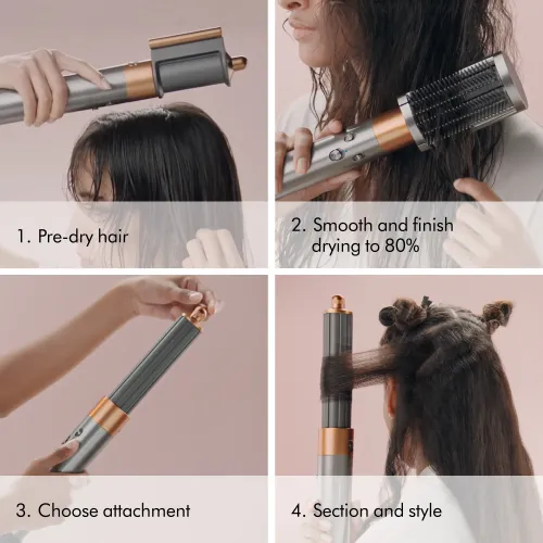 The Dyson Airwrap i.d. Multi-Styler and Dryer in Ceramic Pink and Rose Gold combines intelligent design with personalized styling for sleek, smooth, and voluminous looks. Powered by Dyson’s high-speed digital motor V9, which spins at up to 110,000rpm, it creates the Coanda effect—an advanced airflow technology that styles hair using air instead of extreme heat, helping to protect against damage. This lightweight 1.4 lb styler features three heat and speed settings, along with negative ion technology to reduce frizz and static. Designed specifically for straight and wavy hair types, it includes a curated set of attachments to dry, smooth, shape, and volumize with precision. The long barrels are ideal for creating flowing waves and soft curls, while the smoothing brushes help achieve a polished finish. What sets the Airwrap i.d. apart is its intelligent personalization. With Bluetooth connectivity, it links to the MyDyson app, allowing users to create a custom hair profile and receive tailored styling routines. The Hair Styler even features a color-changing LED display that lets you personalize your styler with your favorite shade. Dyson’s intelligent heat control monitors airflow temperature over 40 times per second to prevent heat damage, and the 8.5 ft cord offers salon-level flexibility. Complete with a premium storage case, this Dyson Airwrap i.d. Multi Hair Styler is a smart solution for effortless, everyday styling.