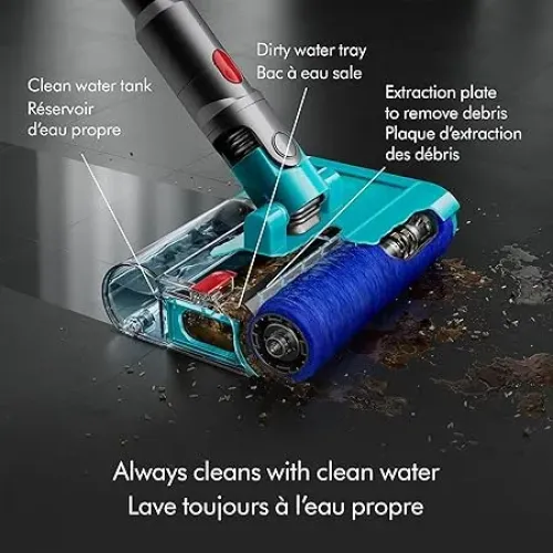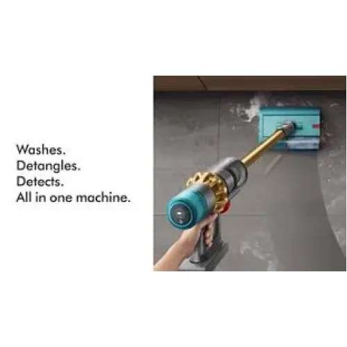 The Dyson V15s Detect is a revolutionary wet-and-dry vacuum cleaner that combines powerful suction, intelligent cleaning, and floor-washing capabilities in one sleek cordless device. This advanced V15s Detect builds upon the success of the Dyson by introducing the Submarine wet roller head, which allows users to vacuum and wash hard floors simultaneously. It effectively removes spills, stains, and dried-on grime from tile, wood, and laminate flooring using a precisely controlled water delivery system that avoids over-saturation. The vacuum also features Dyson’s signature Fluffy Optic cleaner head, equipped with a laser that illuminates microscopic dust on hard floors, ensuring no debris is left behind.For carpeted areas, the V15s includes a Digital Motorbar cleaner head that automatically adapts suction power based on floor type and debris level, thanks to its built-in piezo sensor. This sensor counts and categorizes dust particles in real-time, displaying the data on an LCD screen to give users visual proof of a deep clean. The vacuum cleaner is powered by Dyson’s Hyperdymium motor, delivering up to 240AW of suction, and is supported by a fade-free battery that offers up to 60 minutes of runtime. Despite its robust performance, the unit weighs just 3.75kg (8.3lbs), making it relatively easy to maneuver, although some users may find the trigger-style power control less ergonomic.Additional features include a hygienic point-and-shoot bin emptying system, anti-tangle combs to prevent hair wrap, and a suite of attachments for detailed cleaning, including crevice tools and a combination brush. The Dyson V15s Detect Submarine Absolute is ideal for pet owners, families, and anyone seeking a high-performance, all-in-one cleaning solution. With its ability to vacuum, mop, and detect hidden dust, this V15s Detect sets a new standard for home hygiene.