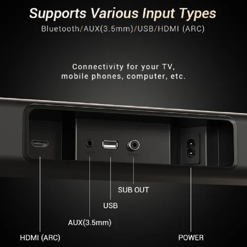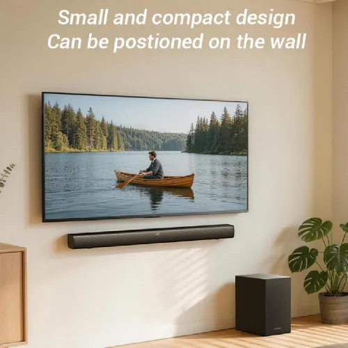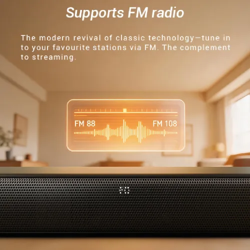 The F&D HT-360 2.1 Soundbar Wireless Bluetooth Speaker is built to deliver powerful audio with a sleek design. With an output power of 100W RMS (60W + 20W x2), this wireless soundbar ensures rich sound for movies, music, and gaming. The frequency response of 50Hz–20KHz provides deep bass and clear highs, while the S/N ratio of ≥70dB guarantees clean audio with minimal distortion. Separation of ≥40dB enhances clarity, giving you a more immersive listening experience. The F&D HT-360 comes with a soundbar size of W810 x D78 x H60mm and a subwoofer size of D280 x W210 x H330mm. Together, they create a balanced setup that fits perfectly in modern living spaces. The product weight of 6.6Kg adds stability without being difficult to move. Driver units include a powerful 6.5" subwoofer and dual satellite drivers of 44-100mm x 2pcs. This combination ensures strong bass and detailed midrange, making the F&D HT-360 a great choice for home entertainment. Connectivity options are wide, with Bluetooth, AUX, USB, HDMI, and FM support. Bluetooth pairing is smooth and stable, allowing you to stream music from smartphones, TVs, or laptops. AUX and USB inputs add flexibility, while HDMI ensures high-quality sound transfer. FM mode lets you enjoy radio channels with ease. The F&D HT-360 runs on 100-240V~50/60Hz 0.8A power input, making it compatible with standard household electricity. This remote control soundbar offers simple operation, letting you manage playback and volume effortlessly. In summary, the F&D HT-360 combines strong output, multiple connection choices, and advanced driver units. It is a wireless soundbar designed for modern homes, delivering both style and powerful performance in one compact package.