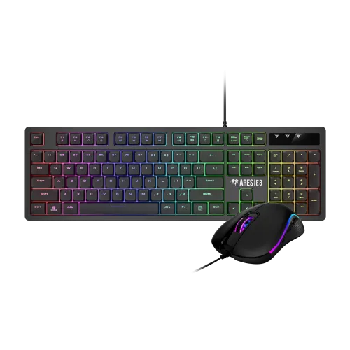 The Gamdias ARES E3 2-IN-1 Gaming Combo is a premium gaming set designed for gamers seeking precision, durability, and style. The Gamdias ARES E3 Combo includes a high-performance keyboard with GAMDIAS-certified membrane switches and a 10 million keystroke lifespan, ensuring long-lasting reliability for intense gaming sessions. Its multi-color backlighting and 6-key rollover enhance gameplay by preventing input conflicts, while the 1.5m USB cable and ergonomic design (446 x 151 x 28.5mm, 545g) provide comfort and convenience. The included gaming mouse features an advanced gaming optical sensor with adjustable 1200, 1800, 2400, and 3600 DPI, delivering precise tracking and smooth responsiveness. With 6 programmable buttons, a 10 million click lifecycle, 125Hz polling rate, and a TPE mouse skate pad, the mouse ensures accuracy and comfort during fast-paced gaming. Compact in size (124 x 61 x 39mm, 93g) and featuring multi-color lighting effects, the Gamdias ARES E3 2-IN-1 Gaming Combo is the perfect all-in-one solution for gamers who want performance, reliability, and style in a single package.