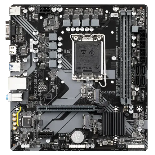 The GIGABYTE B760M H DDR4 mATX Motherboard is designed for Intel Socket LGA 1700 and supports 14th, 13th, and 12th Generation Series Processors. The motherboard's Hybrid 6+1+1 Phases Digital VRM Solution provides unrivaled performance for dependable computing. The Dual Channel DDR4 with 2 DIMMs supports the XMP Memory Module for greater memory capacities. The motherboard has two PCIe 4.0 x4 M.2 connectors for storage, ensuring compatibility with next-generation storage devices. The 14th Gen Motherboard includes an EZ-Latch PCIe 4.0 x16 Slot with a Quick Release Design for easy hardware installation. It also offers dependable network connectivity with GbE LAN and expanded connectivity possibilities with HDMI and D-Sub connectors. The Smart Fan 6 technology improves cooling performance even further by using numerous temperature sensors and hybrid fan headers with FAN STOP functionality, making the GIGABYTE B760M H DDR4 mATX Motherboard a reliable and effective alternative for a variety of computing applications.