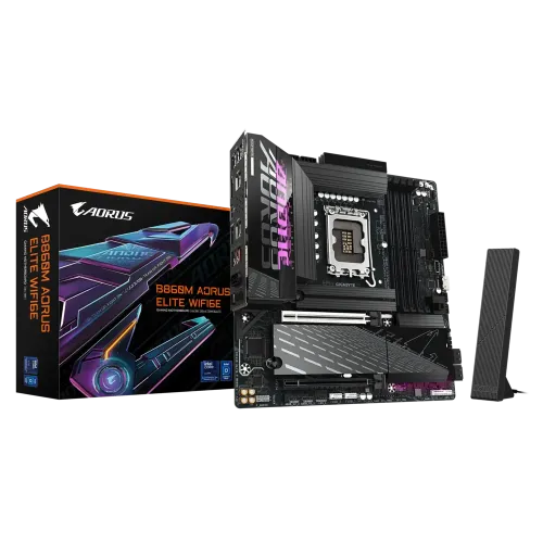 The GIGABYTE B860M AORUS ELITE WIFI6E LGA1851 Micro ATX Motherboard is a powerful powerhouse that supports Intel Core Ultra Processors with its innovative LGA1851 socket and Intel B860 Express Chipset, resulting in remarkable speed and dependability. This GIGABYTE B860M AORUS ELITE WIFI6E Micro ATX Motherboard supports up to 256 GB of DDR5 memory over four DIMM slots at blazing-fast rates of up to 9200 MT/s OC. The motherboard also features dual-channel memory architecture, support for ECC and non-ECC unbuffered DIMMs, and Extreme Memory Profile XMP for effortless overclocking. Graphics performance stands out with quad-display support, featuring a USB4 Type-C port and DisplayPort 2.1 capable of resolutions up to 3840x2160 at 144Hz, alongside HDMI 2.1 for stunning 4K output at 60Hz. The audio experience is immersive, powered by a Realtek Audio CODEC with 7.1-channel High Definition Audio and S/PDIF Out. Connectivity on the GIGABYTE B860M AORUS ELITE WIFI6E Motherboard is unparalleled, boasting Realtek 2.5GbE LAN and either Intel Wi-Fi 6E AX211 or Realtek Wi-Fi 6E RTL8852CE depending on the revision, ensuring ultra-fast networking and seamless Bluetooth 5.3 support. Expandability is made easy with a PCIe 5.0 x16 slot for high-performance GPUs or NVMe SSDs, plus an additional PCIe 4.0 x16 slot x4 mode. Storage is versatile, featuring three M.2 slots, one supporting PCIe 5.0 x4 and two with PCIe 4.0 x4, along with four SATA 6Gb/s ports and RAID support. USB options are plentiful, with a USB4 Type-C port, two USB 3.2 Gen 2 Type-A ports, and numerous USB 3.2 Gen 1 and USB 2.0/1.1 ports across the back panel and internal headers. The GIGABYTE B860M AORUS ELITE WIFI6E also features advanced cooling support with multiple fan and pump headers, plus RGB Gen2 LED headers for customizable lighting. Onboard buttons for power, reset, and Q-Flash Plus make BIOS updates simple and convenient. Optimized for Windows 11, this feature-rich GIGABYTE Motherboard delivers exceptional performance, making the GIGABYTE B860M AORUS ELITE WIFI6E Motherboard the perfect choice for gamers, content creators, and tech enthusiasts looking for cutting-edge technology in a compact Micro ATX form factor.