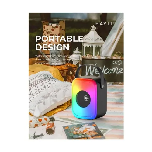 The Havit SQ128BT Bluetooth Speaker with RGB Light is a compact yet powerful portable Bluetooth speaker designed for music lovers who want both performance and style. With its vibrant RGB lighting effects, this speaker creates an engaging atmosphere, making it perfect for indoor gatherings, outdoor hangouts, or personal entertainment. Featuring high-quality audio drivers, the SQ128BT delivers clear sound with balanced bass and crisp treble, ensuring an enjoyable listening experience across a range of music genres. Bluetooth connectivity enables seamless pairing with smartphones, tablets, and other devices, while additional input options offer flexibility for various playback sources. Built for convenience, this portable wireless speaker comes with a rechargeable battery, making it easy to carry and use anywhere without worrying about power. Its durable and lightweight design ensures long-lasting performance, while the intuitive controls make operation simple and user-friendly. Whether you're relaxing at home or enjoying time with friends, the Havit SQ128BT RGB Bluetooth speaker offers a great combination of sound quality, portability, and eye-catching design.