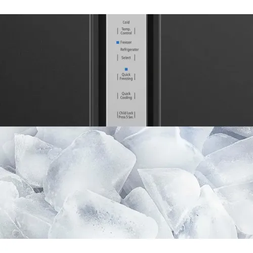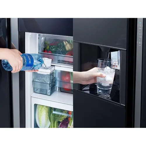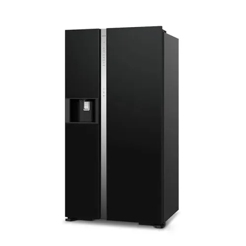 The Hitachi R-SX800GPBO Inverter Refrigerator, with a roomy 633 litre gross capacity and 573 litre net capacity, features a spacious 384 litre refrigerator section and a 249 litre freezer, making it suitable for large households with high storage requirements. The side-by-side arrangement has frameless glass doors for a sleek appearance, while the interior has five tempered glass shelves, three door pockets, an egg tray for 14 eggs, LED lighting, and rapid cooling in the fridge. The vegetable storage is divided into two drawers and a door pocket. The Hitachi R-SX800GPBO 633L Inverter Refrigerator freezer compartment has five tempered glass shelves, two drawers, two door pockets, LED illumination, an automatic ice maker, and quick freezing for fast cooling. General features include an ice and water dispenser with a filtered water tank, a touch screen controller, a mouldproof door gasket, an energy-saving mode, a door alarm, and a Triple Power Filter that removes odors and kills up to 99 percent of bacteria. The Hitachi R-SX800GPBO Inverter Refrigerator's cooling performance is improved by inverter technology, which includes twin fan cooling, dual sensing control with Eco Thermo-Sensors, VIP vacuum insulation panels, no frost operation, and eco-friendly R-600a refrigerant. VIP technology provides outstanding insulation, up to 15 hours of cooling retention during power outages, and increased twin fan airflow, which saves energy and maintains optimal temperatures. Elegant LED-lit interiors, easy-access drawers, and quiet efficiency make the Hitachi R-SX800GPBO 633L Side By Side Inverter Refrigerator a dependable, stylish, and user-friendly Hitachi Refrigerator for modern households. It supports energy-saving performance through dual fan efficiency, smart temperature control, durable glass shelving, spacious compartments, and intuitive controls, ensuring long-term freshness, convenience, hygiene, and reliable daily use for households seeking premium Hitachi R-SX800GPBO Refrigerator performance and capacity.