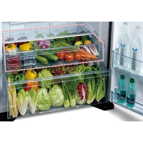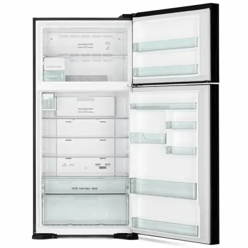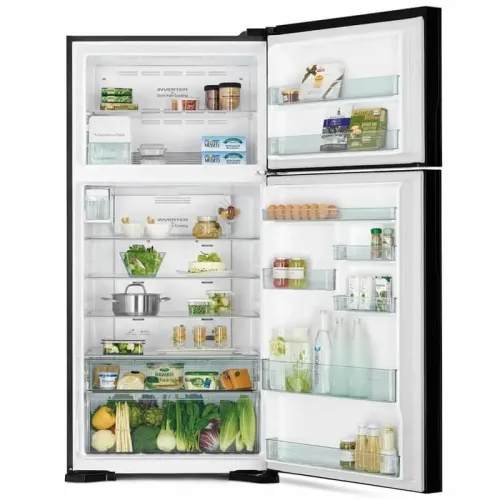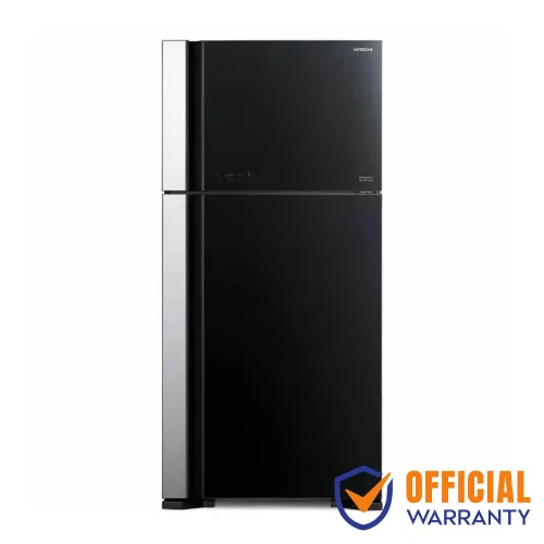 The Hitachi R-VG690P7PB Refrigerator, part of the Big2 series, has a two-door design with a quality glass finish that complements modern kitchens. The Hitachi Refrigerator has a total gross capacity of 601 liters and a net capacity of 550 liters. It features a 427 liter refrigerator and a 174 liter freezer, as well as 405 liters for fresh food and 145 liters for frozen things. The Hitachi R-VG690P7PB 601L Inverter Refrigerator features inverter technology and dual fan cooling to provide continuous airflow and faster cooling throughout all compartments. Dual Sensing Control with Eco Thermo Sensor efficiently adapts cooling to inside conditions, increasing energy economy and food preservation. Users benefit from Fresh Select flexibility, sturdy tempered glass shelves, strong LED lighting, and a large moisture guard vegetable compartment that keeps produce fresher for extended periods of time. The Hitachi R-VG690P7PB 601L Refrigerator's freezer compartment is equally useful, with beautiful frame tempered glass shelves, a movable twist ice tray, quick freezing for fast ice and food preservation, and efficient LED illumination. A modern touch screen controller simplifies temperature control, while the Nano Titanium Filter reduces odors and bacteria for better air circulation. The Hitachi R-VG690P7PB Refrigerator also incorporates important safety and convenience features, such as a door alarm, moldproof door gasket, and no frost operation, which eliminates the need for manual defrosting. This Hitachi Refrigerator uses eco-friendly R-600a refrigerant and is CFC and HFC free, assuring environmental responsibility.