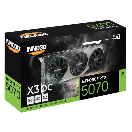 The INNO3D RTX 5070 X3 OC GPU supports cutting‑edge technologies such as DLSS 4, Ray Reconstruction, and Super Resolution, which leverage AI to boost frame rates and enhance image quality. With 4th‑gen Ray Tracing cores, gamers can enjoy realistic lighting, reflections, and shadows, while 5th‑gen Tensor cores deliver advanced AI performance for rendering, upscaling, and productivity tasks.
