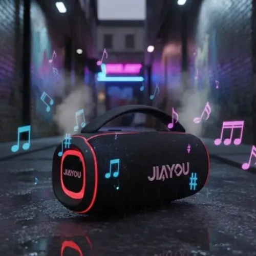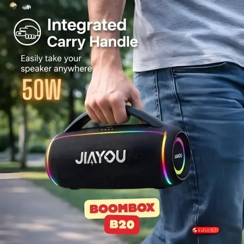 The Jiayou Boombox B20 Portable Bluetooth Speaker is a powerful wireless speaker built for clear sound and easy use. It delivers 50W audio output with strong bass, smooth mids, and sharp highs, perfect for outdoor parties, family gatherings, or large spaces. This rechargeable speaker offers up to 8 hours of playtime, giving you long hours of nonstop music. With IPX7 waterproof protection, it stays safe from rain, splashes, and even full water dips, efficient for poolside or beach fun. The design is tough yet stylish, shaped horizontally with a carry handle that makes the portable speaker simple to move. Dual RGB breathing light rings glow with your music, adding colorful energy to the atmosphere. You can connect it in many ways, including wireless Bluetooth, USB playback, or a 3.5mm Aux input, giving freedom to play music from different devices. Whether you want wireless streaming, plug in a USB drive, or use Aux, this wireless speaker adjusts to your setup. The Jiayou Boombox B20 is the most powerful model in the Jiayou series, built to deliver room-filling sound and lasting performance. It combines portability, waterproof safety, rechargeable battery, and flexible connections, a complete choice for music anywhere. This rechargeable speaker blends sound, light, and convenience, offering a high-quality portable speaker experience that is strong, stylish, and ready for entertainment indoors or outdoors.