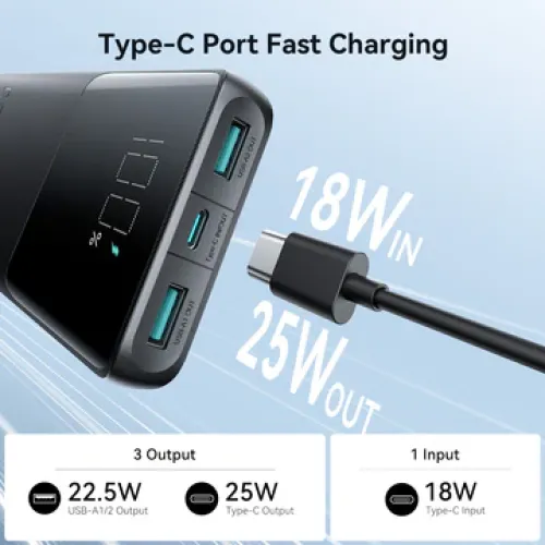The Joyroom JR-PBF20 10000mAh 25W Super Fast Charging Power Bank is a compact yet powerful solution for on-the-go charging, designed to meet the demands of modern mobile users. Equipped with 25W Super Fast Charging technology, it delivers optimized high-speed power delivery for smartphones and other compatible devices, ensuring minimal downtime. Its bidirectional Type-C port supports both input and output, offering flexible charging and recharging options. The triple-port configuration featuring 1× Type-C and 2× USB-A ports allows users to charge up to three devices simultaneously, making it ideal for multitasking professionals and travelers.A standout feature is the smart digital display, which provides real-time updates on battery level and fast-charging status, enhancing user convenience and control. With a 10000mAh capacity, the Joyroom JR-PBF20 offers approximately two full charges for most smartphones, while its intelligent cooling system ensures safe operation by regulating internal temperatures. This Joyroom power bank supports multi-protocol fast charging standards including QC3.0, PPS 25W, PD 20W, and AFC 18W, ensuring broad compatibility across a wide range of devices. Whether you're commuting, traveling, or working remotely, the Joyroom JR-PBF20 is a reliable and efficient power companion that combines speed, safety, and versatility in one sleek package.