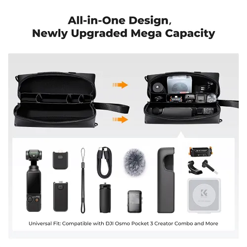 The K&F Concept KF13.200 Carrying Case is a premium solution designed to protect and transport your DJI Osmo Pocket 3 Creator Combo and accessories with ease. This K&F Concept KF13.200 Protective Carrying Case features a custom-fit design for the Creator Combo, offering dedicated compartments for the camera, microphone, tripod, charger, and more, keeping all your gear organized and secure. Its hard EVA shell combined with a soft padded interior provides maximum protection against bumps and shocks, while the durable zipper closure ensures your equipment stays safe during travel. Despite its robust protection, the case remains compact and lightweight, making it perfect for vloggers, filmmakers, and content creators on the go. The ergonomic carry handle allows for easy portability, so you can transport your fully assembled gear comfortably. Overall, the K&F Concept KF13.200 Protective Case for DJI Osmo Pocket 3 Creator Combo is an ideal choice for anyone seeking a durable, portable, and organized carrying solution that keeps their equipment ready for any shooting scenario.