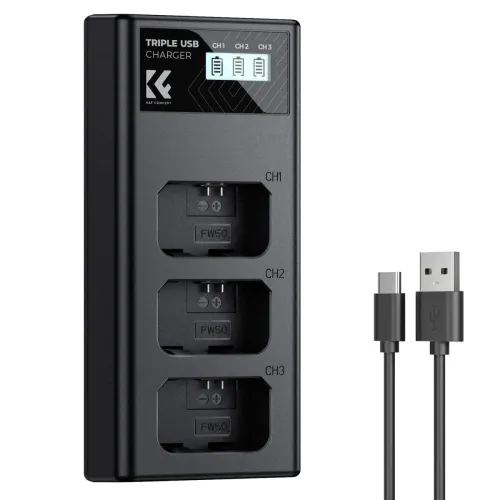 The K&F Concept NP-FW50 3-Slot Camera Battery Charger is a dependable charging solution developed for Sony cameras. The K&F Concept NP-FW50 3-Slot Camera Battery Charger is designed to support NP-FW50 batteries and is fully compatible with popular Sony models such as the A6000, A6400, A7, A7 II, and ZV-E10, making it an excellent choice for both photography and video operations. This K&F Concept NP-FW50 Camera Battery Charger has a triple-channel design that allows users to charge up to three NP-FW50 batteries at the same time or independently, providing uninterrupted shooting sessions even throughout protracted projects. The K&F Concept Camera Battery Charger has a clear LCD digital display with a four-level indicator, allowing customers to see the charging status of each battery in real time. This sophisticated display increases transparency and confidence, especially when controlling numerous batteries simultaneously. The K&F Concept NP-FW50 Battery Charger features two input interfaces, including micro-USB and Type-C, for modern communication and efficient power supply. Although only a Type-C connection is included, the K&F Concept NP-FW50 Camera Battery Charger is extremely adaptable and may be powered by a laptop, PC, wall charger, auto charger, or power bank. This makes the K&F Concept Camera Battery Charger an ideal companion for studio, vacation, and outdoor photography. The K&F Concept NP-FW50 3-Slot Camera Battery Charger's primary characteristics are its safety and reliability. It features six layers of intelligent protection against overcharging, short circuits, excessive temperatures, overcurrent, overvoltage, and electrical shock.