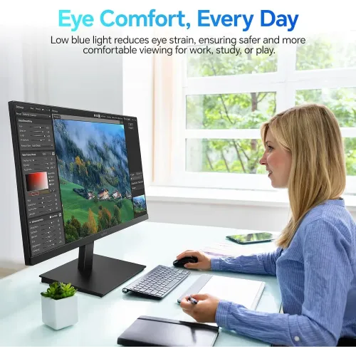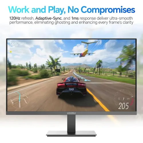 The KOORUI E2721H Monitor is a 27-inch IPS panel with a native QHD 2560×1440 resolution. Its fine details and rich clarity make each frame shine out. The KOORUI E2721H 27" 120Hz Monitor has a three-sided ultra-thin bezel that provides a modern, immersive picture, and the 178-degree wide viewing angle delivers consistent colors from any direction. Gamers and multitaskers will love the KOORUI E2721H 27" QHD Monitor's 120Hz refresh rate and fast 1ms MPRT response time, which allows for smooth, fluid, and tear-free graphics in fast-moving scenes. The KOORUI E2721H QHD Monitor also excels in color performance, with 99 percent sRGB and 95 percent DCI-P3 color gamut coverage. The 1000:1 contrast ratio and 250 cd/m² brightness ensure balanced tones and pleasurable visual quality, making it ideal for daily workloads, video playback, and creative work. The KOORUI E2721H Monitor features flicker-free technology and a low blue light setting to prevent eye strain over extended periods of use, allowing you to stay comfortable when gaming, studying, or working. Smooth performance is further increased by Adaptive Sync, FreeSync, and G-Sync compatibility, which ensures the KOORUI Monitor remains stable and responsive even during intense gameplay. Connectivity is simple with HDMI 2.0, DisplayPort, and a 3.5mm audio out port, making it easy to link the KOORUI E2721H 27" 120Hz 1ms QHD IPS Monitor to gaming consoles like Xbox and PS5, as well as desktops and laptops. It also supports a 100×100mm VESA mount for flexible installation, while its tilt range of -5° to 15° helps you find a comfortable viewing angle.