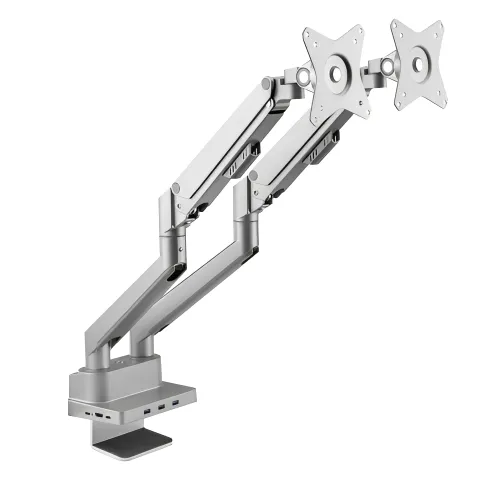 The Lenovo Services AM220 GR Double Monitor Arm is a durable and ergonomic mounting solution designed to support dual displays while enhancing workspace efficiency and comfort. Built with strong steel and aluminum construction, this double monitor arm can hold two monitors up to 32″ each, with a maximum weight capacity of 9 kg per arm, ensuring stability and compatibility for both office and home setups. The Lenovo Monitor Mount offers flexible adjustability with a tilt range of ±45°, swivel range of ±90°, and screen rotation of ±180°, giving users the freedom to position each monitor independently for optimal viewing angles. With VESA mount compatibility (75×75 mm and 100×100 mm), installation is quick and secure across most standard monitors. Designed to reduce clutter and improve posture, the Lenovo Double Monitor Arm helps create a clean, organized, and ergonomic workstation. Overall, the Lenovo AM220 GR Double Monitor Arm combines strength, versatility, and sleek design, making it an excellent choice for professionals, gamers, and multitaskers who want a reliable and space‑saving dual monitor mounting solution.
