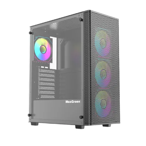 The MaxGreen PS195-15 Mid-Tower ATX Gaming Case with M57 ARGB Fan is a stylish and performance-driven chassis designed for gamers and PC enthusiasts who want both functionality and aesthetics in their build. Crafted with a durable steel frame and a tempered glass side panel, it allows users to showcase their hardware and vibrant ARGB lighting effects. The MaxGreen PS195-15 case comes pre-installed with four ARGB fans, including the M57 ARGB fan, ensuring excellent airflow and customizable illumination to match any gaming setup. Its mesh front panel enhances ventilation, while support for multiple fan and radiator configurations including up to a 360mm radiator in the front makes it suitable for high-performance cooling solutions. The PS195-15 supports ATX motherboards, large GPUs, and multiple expansion slots, offering flexibility for future upgrades. On the front I/O, it provides convenient access to one USB 3.0 port, two USB 2.0 ports, and HD audio connections, making it practical for everyday use. With its sleek black finish, modern design, and balance of affordability and premium features, the MaxGreen PS195-15 is an excellent choice for gamers who want a case that combines durability, airflow, and eye-catching ARGB aesthetics.