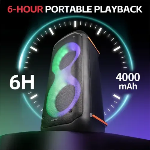 The Microlab PT602W Bluetooth Party Speaker is a powerful and feature-rich portable party speaker designed for music, karaoke, and outdoor entertainment. With a 40W RMS output, it delivers strong, room-filling sound with deep bass and clear vocals, making it ideal for parties, gatherings, and events. Equipped with Bluetooth 5.0 connectivity, this speaker ensures stable wireless streaming from smartphones, laptops, and tablets. It also supports multiple input options, including USB, TF card, AUX, and dual microphone inputs, giving you maximum flexibility for different playback sources. The built-in TWS (True Wireless Stereo) feature allows you to pair two speakers together for a wider and more immersive stereo experience. The PT602W is designed for entertainment with dual 6.5-inch woofers and a tweeter, delivering balanced audio with enhanced bass and clear highs. It also comes with two wireless microphones, making it perfect for karaoke sessions, announcements, and live performances. Colorful LED lighting effects add a dynamic party atmosphere, enhancing your overall experience. Powered by a 4000mAh rechargeable battery, the speaker offers up to 6 hours of playback on a single charge, while fast charging ensures minimal downtime. Its portable design, durable build, and included remote control make it easy to use both indoors and outdoors. Whether you're hosting a party, enjoying music with friends, or setting up a karaoke session, the Microlab PT602W party speaker delivers a complete package of powerful sound, versatile connectivity, and fun lighting effects at an affordable price.