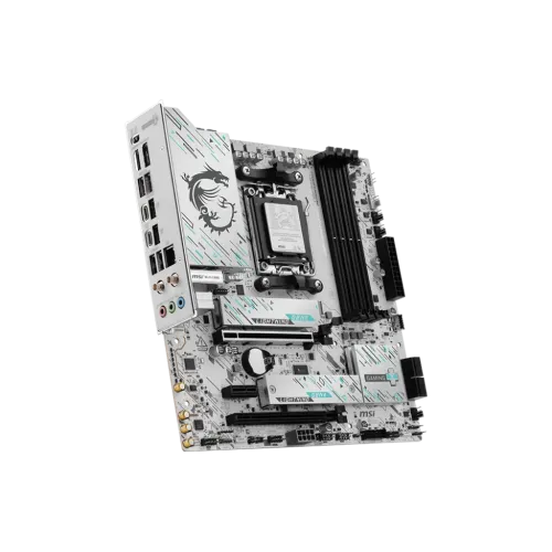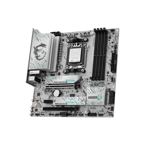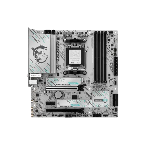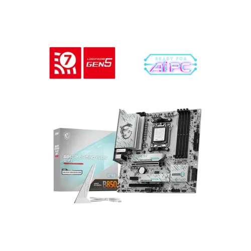 The MSI B850M GAMING PLUS WIFI AM5 mATX Motherboard represents a robust solution designed for gaming enthusiasts, content creators, and users who demand high performance with modern connectivity and dependable operation. Built upon the AMD B850 chipset and AM5 socket foundation, this micro-ATX form factor board accommodates the newest AMD Ryzen 9000, 8000, and 7000 Series desktop processors, providing advanced performance capabilities and forward-looking compatibility. The MSI B850M motherboard supports memory configurations up to 256GB using DDR5 technology across four UDIMM slots, enabling users to achieve exceptional speeds reaching 8200+ MT/s when overclocked, with particular optimization for Ryzen 9000 Series processors. The design incorporates dual-channel memory architecture, AMD EXPO compatibility, and sophisticated overclocking features, positioning it as an excellent choice for demanding computing tasks and gaming applications. Display connectivity options encompass HDMI 2.1 and DisplayPort 1.4 outputs, each capable of delivering 4K resolution at 60Hz refresh rates, providing exceptional visual quality when used with processors that include integrated graphics capabilities. System expansion opportunities include two PCIe x16 slots alongside one PCIe x1 slot, incorporating Gen 5.0 compatibility for premium graphics cards and Gen 4.0/3.0 support for diverse expansion components. Storage capabilities offer exceptional versatility through dual M.2 connections supporting PCIe 5.0/4.0 standards and four SATA 6Gb/s connections, with RAID configuration options including 0/1/10 for SATA devices and 0/1 for NVMe storage solutions. Audio functionality utilizes the Realtek ALC897 processor, providing 7.1-channel high-definition sound output for superior gaming and multimedia experiences. Network connectivity features forward-thinking technology with Realtek 8126 5G LAN capability and built-in Wi-Fi 7 (802.11be) support, incorporating MU-MIMO technology, tri-band operation across 2.4GHz/5GHz/6GHz frequencies, and Bluetooth 5.4 for exceptional wireless connectivity performance. The MSI B850M GAMING PLUS WIFI incorporates comprehensive internal connectivity, including multiple fan connection points, RGB lighting connectors (JARGB_V2 and JRGB), TPM 2.0 compatibility, and extensive USB port selection featuring USB 10Gbps Type-C and Type-A connections on front and rear interfaces. System diagnostics and monitoring capabilities include 4x EZ Debug LEDs and an EZ Memory Detection LED for simplified troubleshooting and system status verification. Optimized for Windows 11 64-bit operating systems, the MSI B850M GAMING PLUS WIFI serves as an ideal solution for users requiring high-performance computing capabilities.